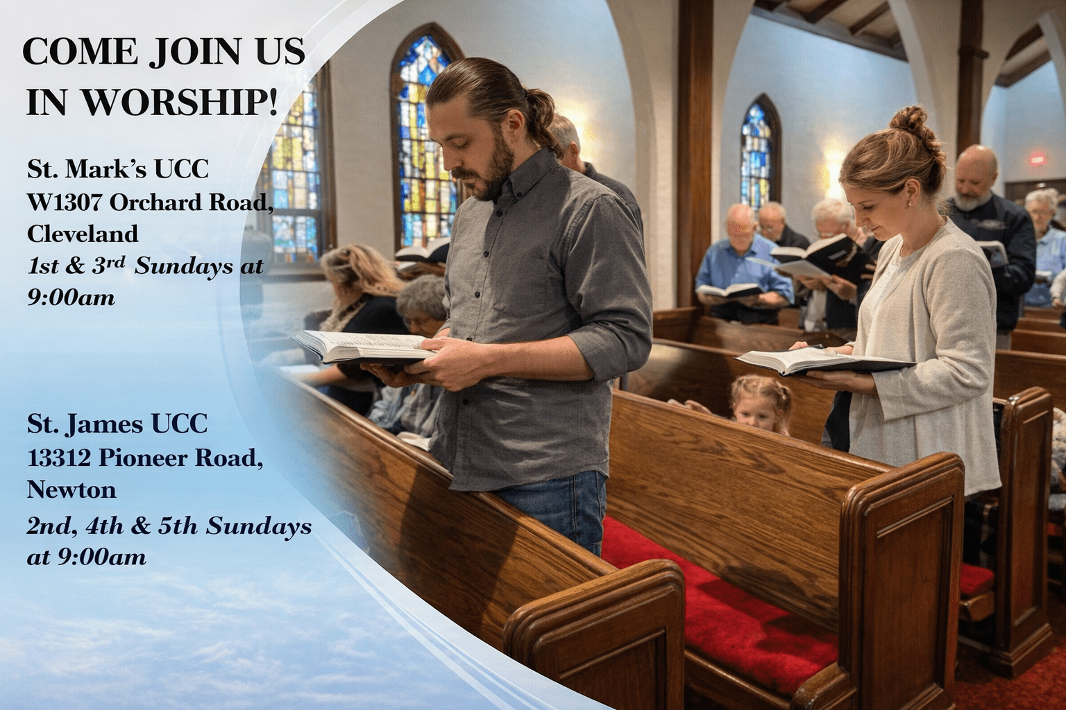 Both churches offer the same message each Sunday, so choose a worship time that fits your schedule! Communion is an open table to all who have a desire to know Christ more fully. We belong to the Wisconsin Conference, United Church of Christ.