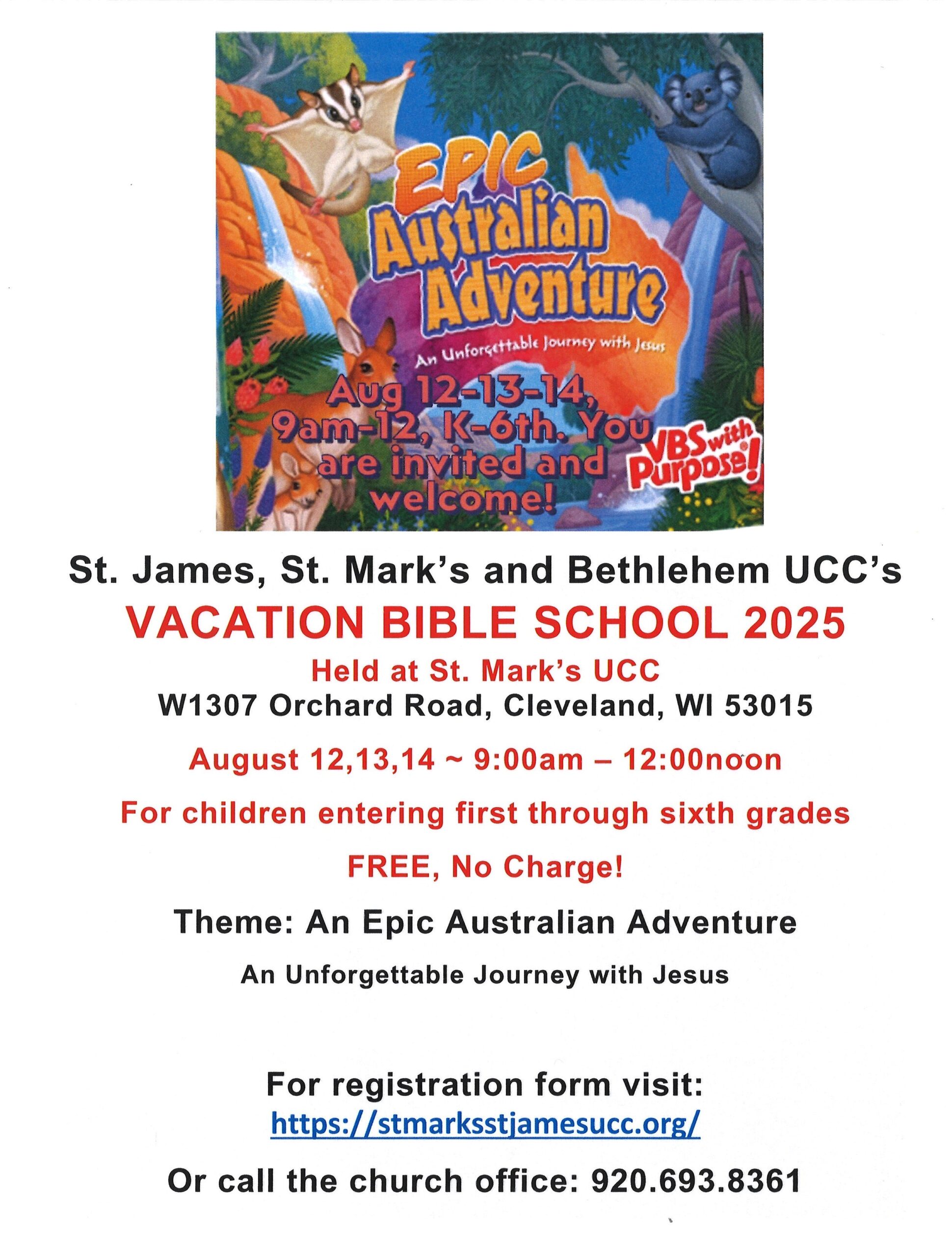 Come join us for three fun-filled mornings while learning more about God. Contact Pastor Patrick to enroll, if you have questions, or if you’d like to help. There is no charge to attend. schultzpw@gmail.com or call St. Mark’s: 920.693.8361